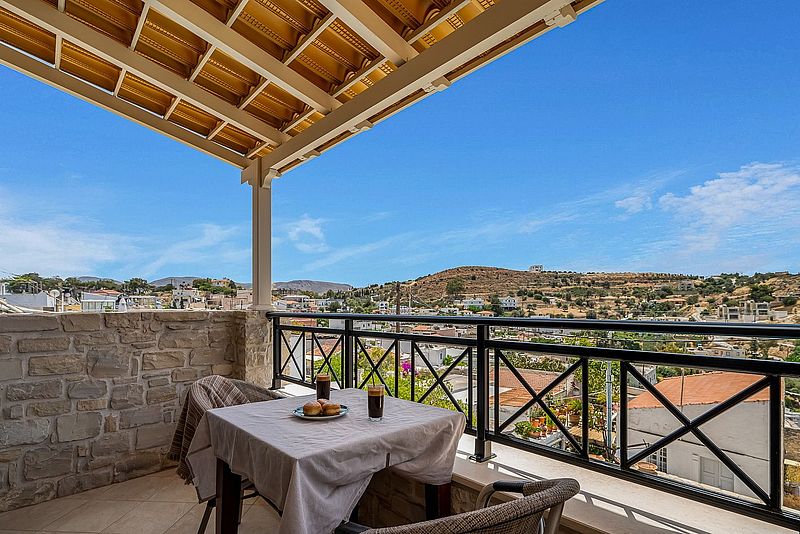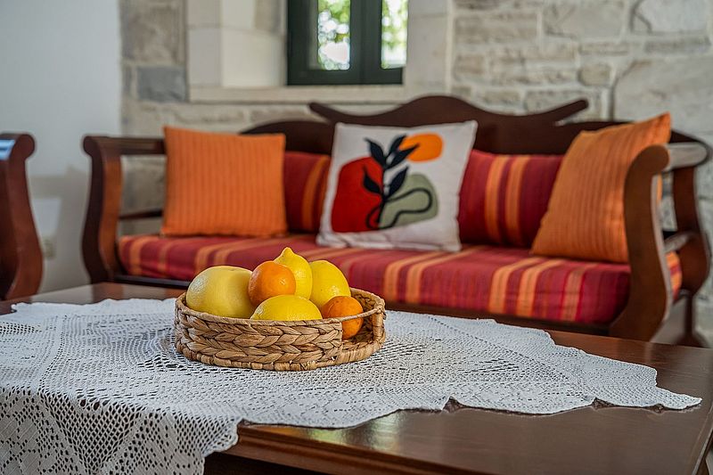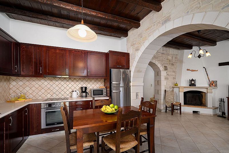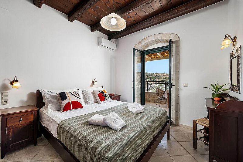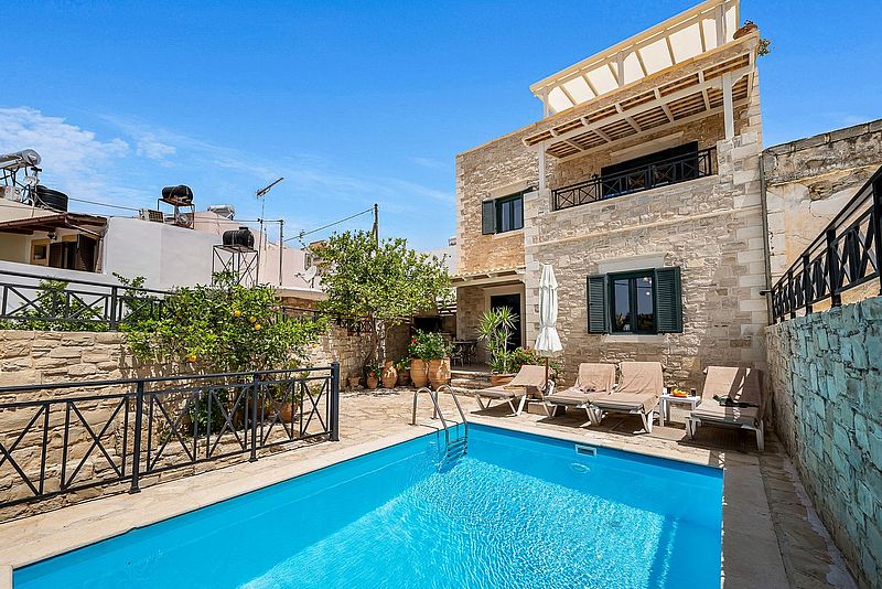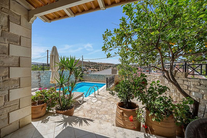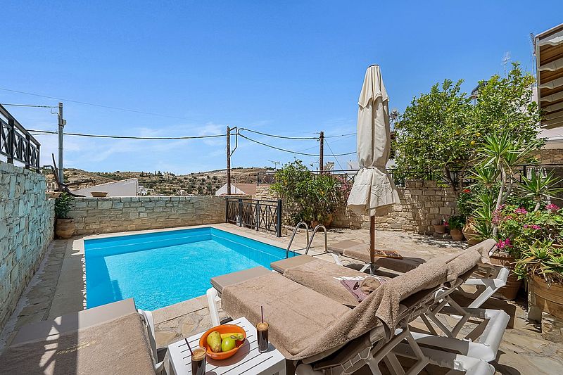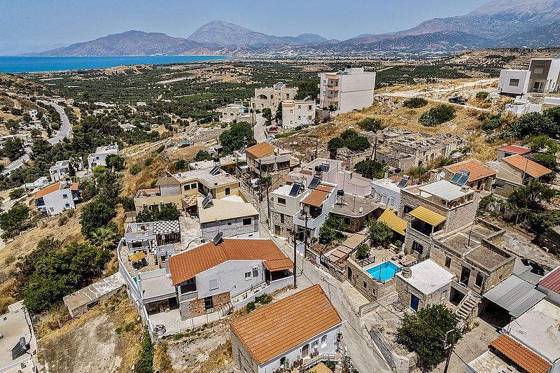 Das Ferienhaus PANO SPITI hat 2 Schlafzimmer für 4 bis max. 5 Personen sowie 2 Bäder. Die Wohnfläche beträgt ca.110 qm plus Balkon. Neben der großer Dachterrasse und einem Balkon vor einem der Schlafzimmer, hat es noch eine Veranda um den Swimming Pool (20 qm) herum, welcher natürlich zur alleinigen Nutzung bestimmt ist. Der gemauerte Grill auf der Veranda bietet die Möglichkeit, jederzeit selbst gegrillten frischen Fisch oder leckeres Lamm nach eigenen Vorlieben frisch zubereiten zu können. Unten im Haus befindet sich die offene Wohnküche, welche durch einen Steinbogen vom Wohnzimmer getrennt ist. In der kühleren Jahreszeit kann das Haus mit der Aircondition und auch dem offenen Kamin beheizt werden. In der oberen Etage befinden sich die 2 Schlafzimmer. Eines der Zimmer hat ein Doppelbett und das zweite Schlafzimmer hat mit einem Einzelbett und einem Etagenbett insgesamt Platz für 3 Personen. Auf der selben Etage befindet sich das größere Badezimmer mit einer Wanne mit Hydromassage. Eine Waschmaschine ist ebenfalls vorhanden. Vom Balkon und der Dachterrasse hat man einen wunderbaren Panorama-Blick über das Dorf und die Umgebung, bis hin zum Meer Richtung Tymbaki. Der Preis beträgt je nach Saison 1295Euro bis 1390Euro pro Woche (im Winter bitte Sonderpreis anfragen) inklusive einer Zwischen- und der Endreinigung und des o.g. Service. Bettwäsche, Geschirrtücher und Handtücher /Pooltücher sind vorhanden. Die Klimaresilienzabgabe ist nicht im Mietpreis enthalten und wird separat vor Ort abgewickelt. Das Haus besitzt die Genehmigung mit der EOT-Lizenz Nr. MITE 1039K10000041800.