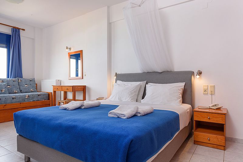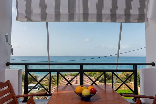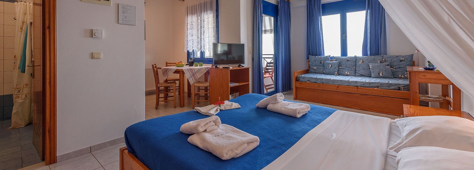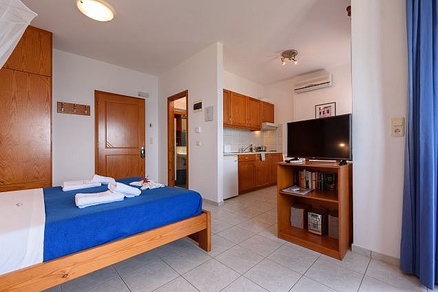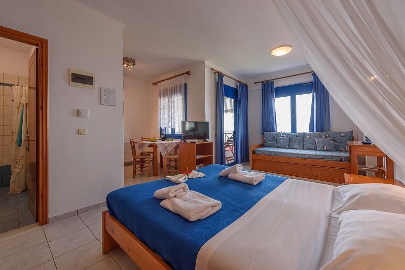 Im Studio hat man alles, was man braucht. Die Zimmer sind liebevoll eingerichtet und sowohl am Küchentisch als auch auf dem Balkon lässt sich auch gut arbeiten. In den kleinen Küchen ist an alles gedacht. Es sind u.a. Toaster, Wasserkocher und Kaffeemaschine ebenso wie ausreichend Geschirr und Besteck vorhanden. Das Bett steht im selben Raum, ebenso das Einzelbett, welches als Sofa zurecht gemacht ist. Ein Fernseher (SAT TV Flach-Bildschirm) und Musikabspielgerät sind vorhanden. Sollten Sie etwas Bestimmtes benötigen, sagen Sie gern Bescheid. Der Service umfasst tägliche Reinigung und 3 tägig frische Bettwäsche und Handtücher (auch Geschirrtücher und Spül-schwamm und Wischlappen). Private Wäsche kann gegen einen kleinen Unkostenbeitrag zum Waschen gegeben werden. Die Preise sind nach Saison und Aufenthaltsdauer sowie Lage bzw. Meerblick des konkreten Studios gestaffelt und liegen preislich zwischen 75 Euro und 83 Euro pro Nacht. E.O.T. Lizens: ΜΗΤΕ 1039Κ032Α0013001