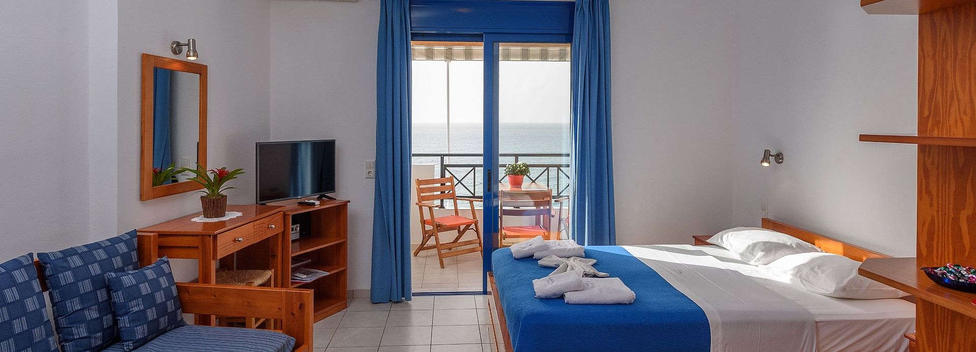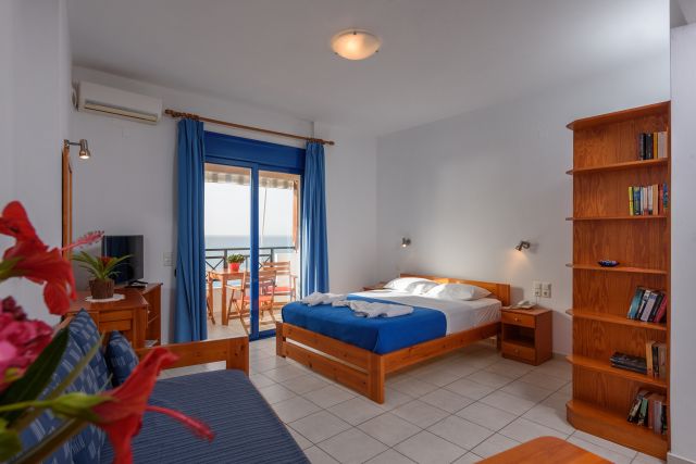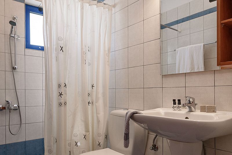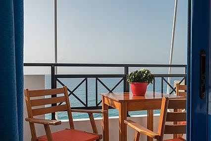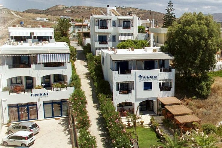Da die Anlage an einem Hang gelegen ist, haben auch die Wohneinheiten im hinteren FINIKAS Haus II Blick auf das Meer. Die beiden Einraum-Studios im FINIKAS II sind ebenso sorgfältig ausgestattet, wie alle Apartments und Studios im FINIKAS. Die Zimmer sind hell und freundlich und man kann sehr schön auf dem Balkon sitzen, wo eine Markise vor zuviel Sonne schützt. In der kleinen Küche steht ein Holztisch mit 3 Stühlen, wenn es auf dem Balkon einmal zu warm sein sollte, kann man auch hier bequem sitzen. Die Küche ist so gut ausgestattet, so dass man gut einfache Gerichte kochen und Speisen zubereiten kann. Der Strand liegt direkt vor dem Haupthaus FINIKAS I, wo man auf der großen Veranda auch immer ein schattiges Plätzchen findet. Der Service umfasst tägliche Reinigung und 3 tägig frische Bettwäsche und Handtücher (auch Geschirrtücher und Spül-schwamm und Wischlappen). Private Wäsche kann gegen einen kleinen Unkostenbeitrag zum Waschen gegeben werden. Die Studios kosten zwischen 68 Euro und 80 Euro pro Nacht, je nach Saison und Aufenthaltsdauer. E.O.T. Lizens: ΜΗΤΕ 1039Κ032Α0013001